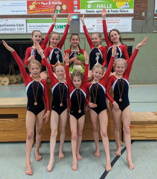 Für eine schöne Überraschung sorgten im Wettkampf 4 die jüngsten Telgterinnen (Jahrgang 2017 und jünger). Mathilda Gebauer, Pia Leuker, Fritzi Lüken, Sanna Spiegel und Paula Probst erkämpften sich mit Platz drei einen nicht für möglich gehaltenen Podestplatz und damit die Qualifikation für den Gau-Entscheid, die Münsterlandmeisterschaften in drei Wochen in Beckum. Mathilda Gebauer glänzte hier besonders mit der dritthöchsten Einzelwertung des Wettkampfes.